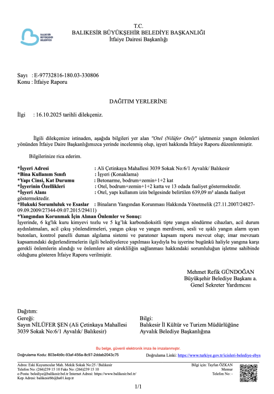 Tesisimizin yangın önlemlerine uygunluğunu belgeleyen İtfaiye Uygunluk Belgesi‘ni gururla sunuyoruz. Bu belge, Nilüfer Otel’de güvenle konaklayabileceğinizin bir taahhüdüdür.